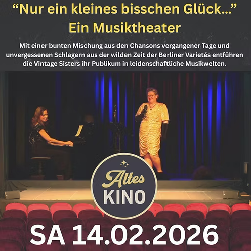 Mit einer bunten Mischung aus den Chansons vergangener Tage und unvergessenen Schlagern aus der wilden Zeit der Berliner Varietés entführen die Vintage Sisters ihr Publikum in leidenschaftliche Musikwelten. Ihr aktuelles Programm „Nur ein kleines bisschen Glück…“ behandelt das zeitlose Thema der Sehnsucht und Liebe und ihrer Irrungen und Wirrungen, das mit viel Augenzwinkern, musikalischer Kreativität und einer Prise Theater und Film präsentiert wird.